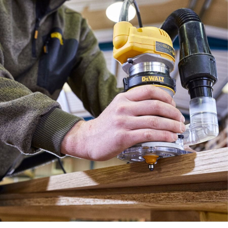 Frezarka krawędziowa DeWalt D26200 900W z tulejką 8 mm, regulacją obrotów i podświetleniem LED. Stabilna, precyzyjna, idealna do drewna, tworzyw i aluminium. Kompatybilna z wieloma akcesoriami.