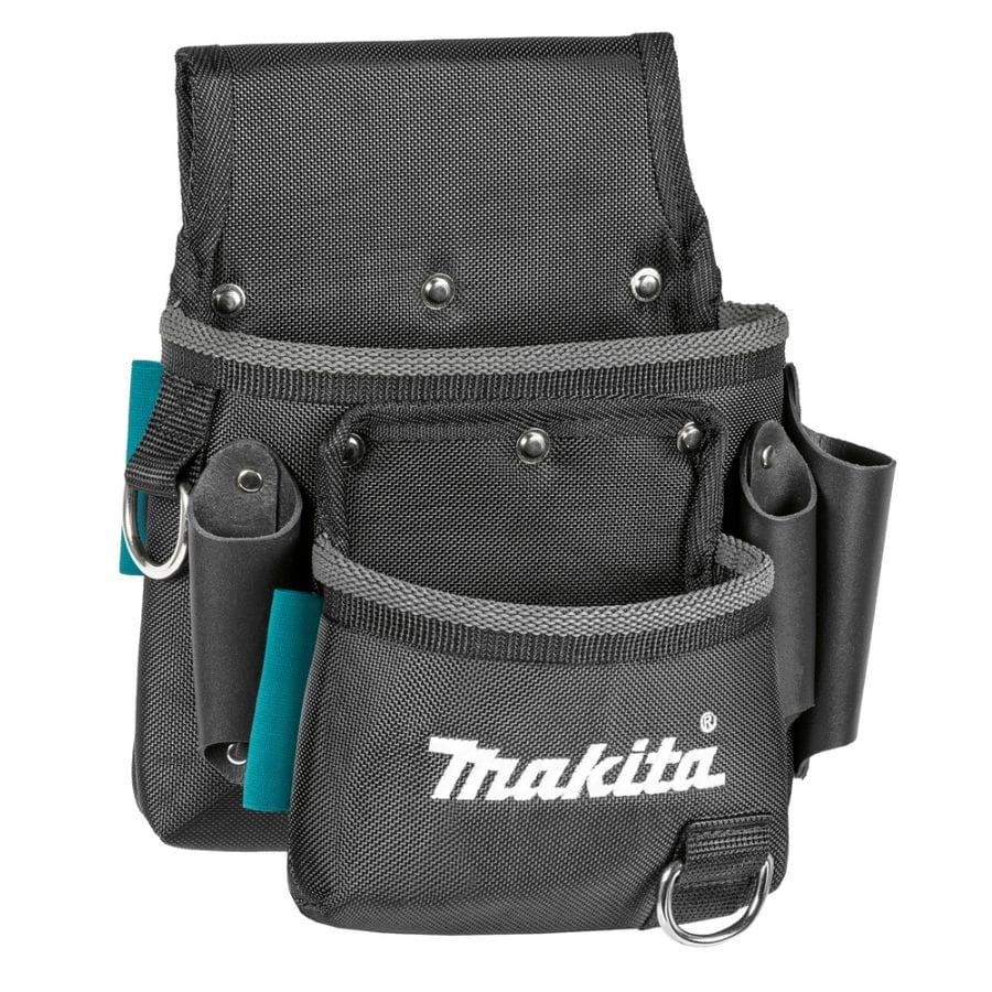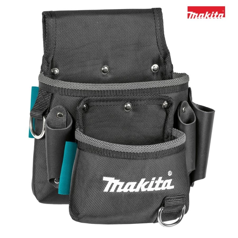 Makita E-15198 – 2-komorowa kabura na narzędzia z 3 uchwytami skórzanymi, 7 pętlami, 2 D-ringami, wykonana z trwałego poliestru 1680D. Idealna do pracy w trudnych warunkach.