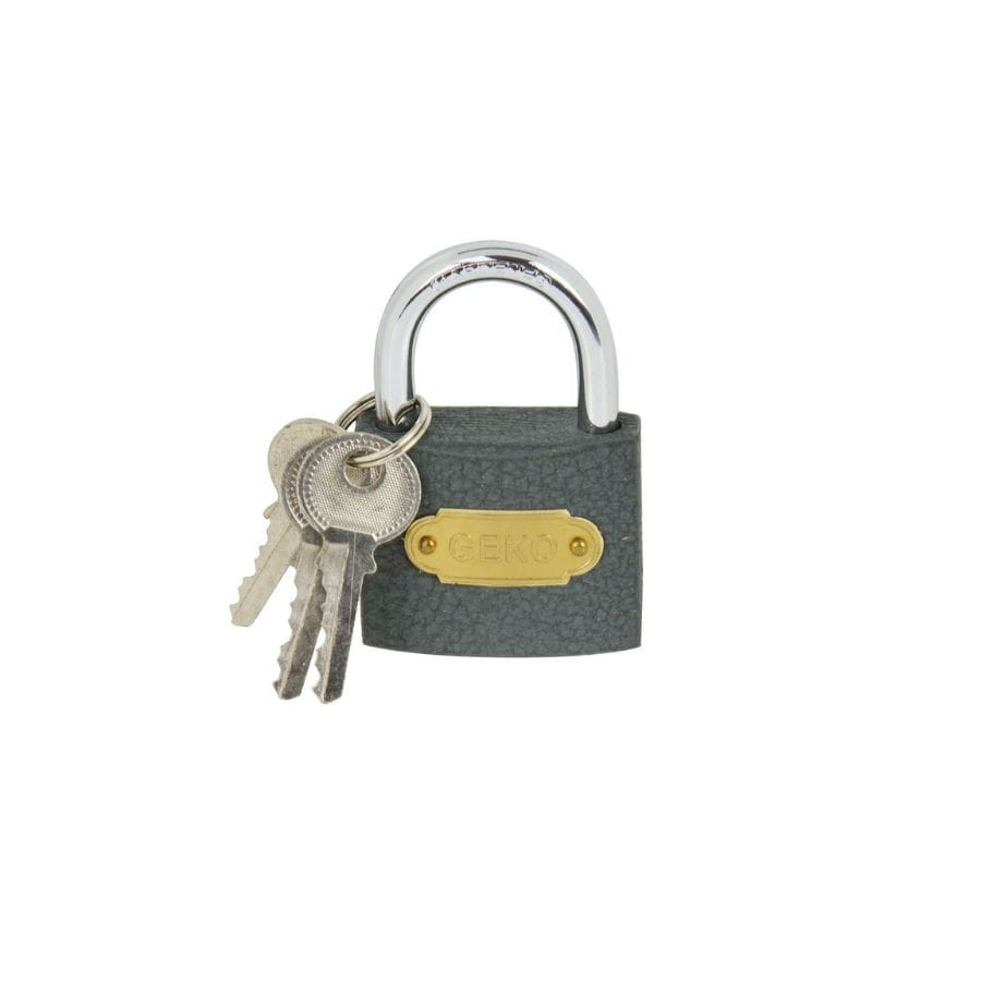 Kłódka żeliwna Geko G01312 50 mm ze stali i żeliwa, srebrno-szara, z 3 kluczami. Solidna ochrona drzwi, bram, szafek i skrzynek, trwała i odporna na uszkodzenia.