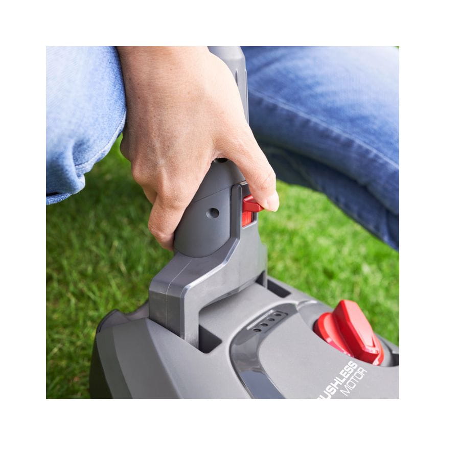 - Wysokość koszenia można regulować 3-krotnie w zakresie 30, 40 i 50 mm, a dźwignię sterowania można łatwo zablokować podczas jazdy na wprost.