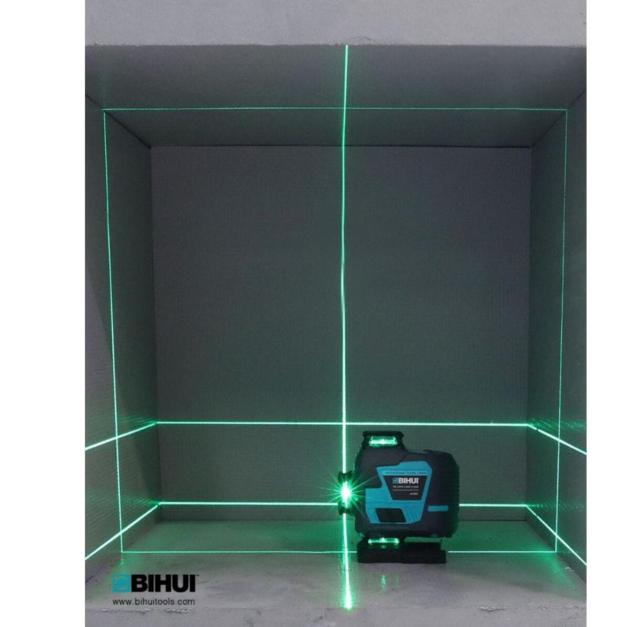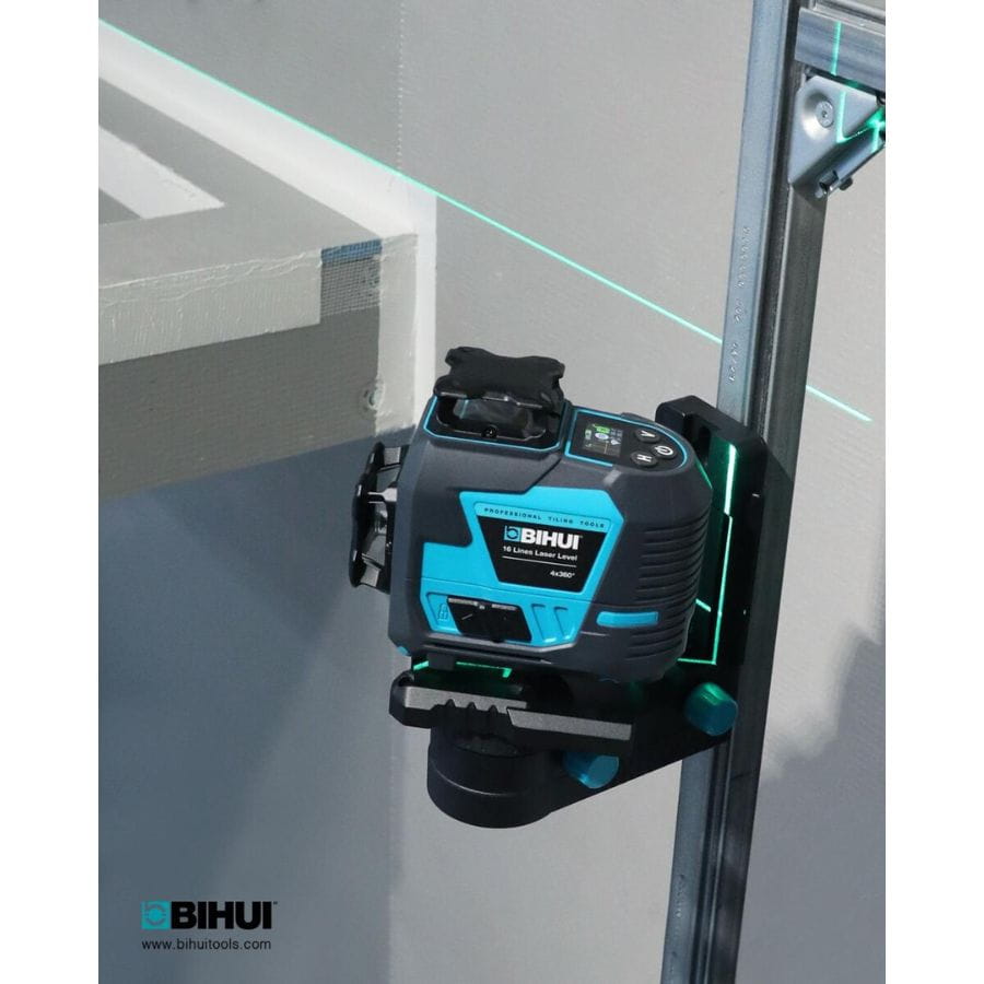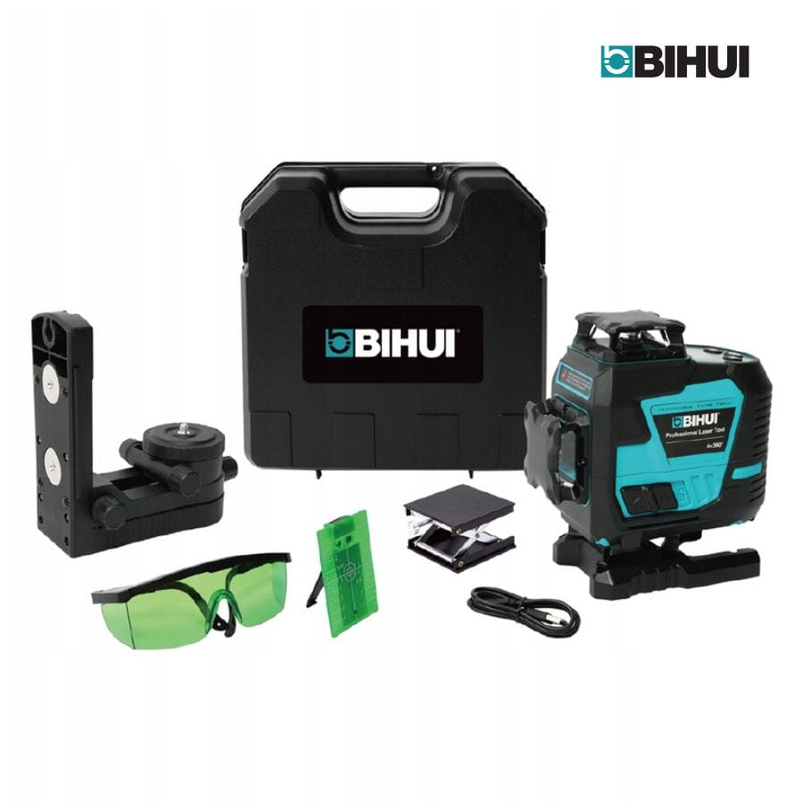 Laser liniowy Bihui LLG16 – 16 zielonych wiązek 360°, samopoziomowanie, dokładność ±3 mm/10 m, wyświetlacz TFT, IP54, 5–12 h pracy, idealny do prac budowlanych i wykończeniowych.