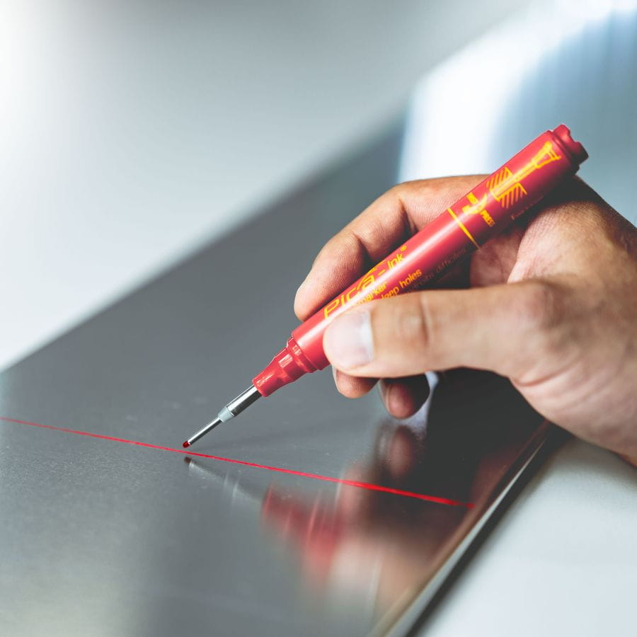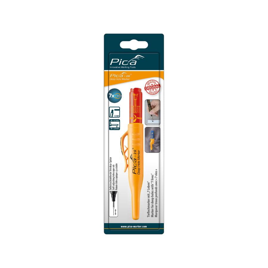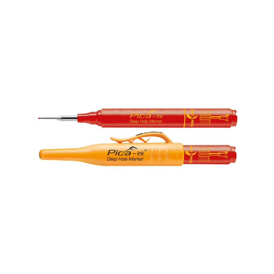 Marker budowlany do głębokich otworów - czerwony 2mm Pica Ink 150/40 to profesjonalny marker do głębokich otworów z końcówką 1,5 mm i długością sworznia 150 mm. Szybkoschnący tusz pisze na większości suchych powierzchni. Długa, teleskopowa końcówka ze stali nierdzewnej pozwala na precyzyjne znakowanie w trudno dostępnych miejscach. Wyposażony w praktyczny klips i system Twist&Revive, który umożliwia wielokrotne użycie końcówki.