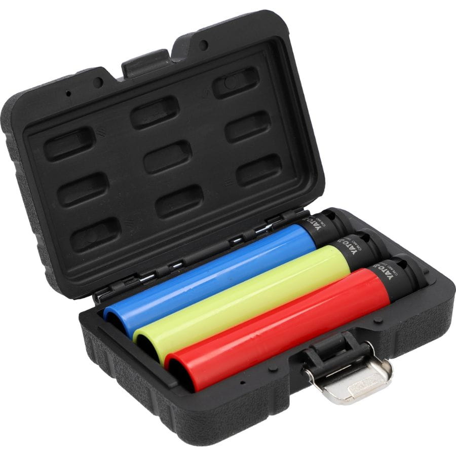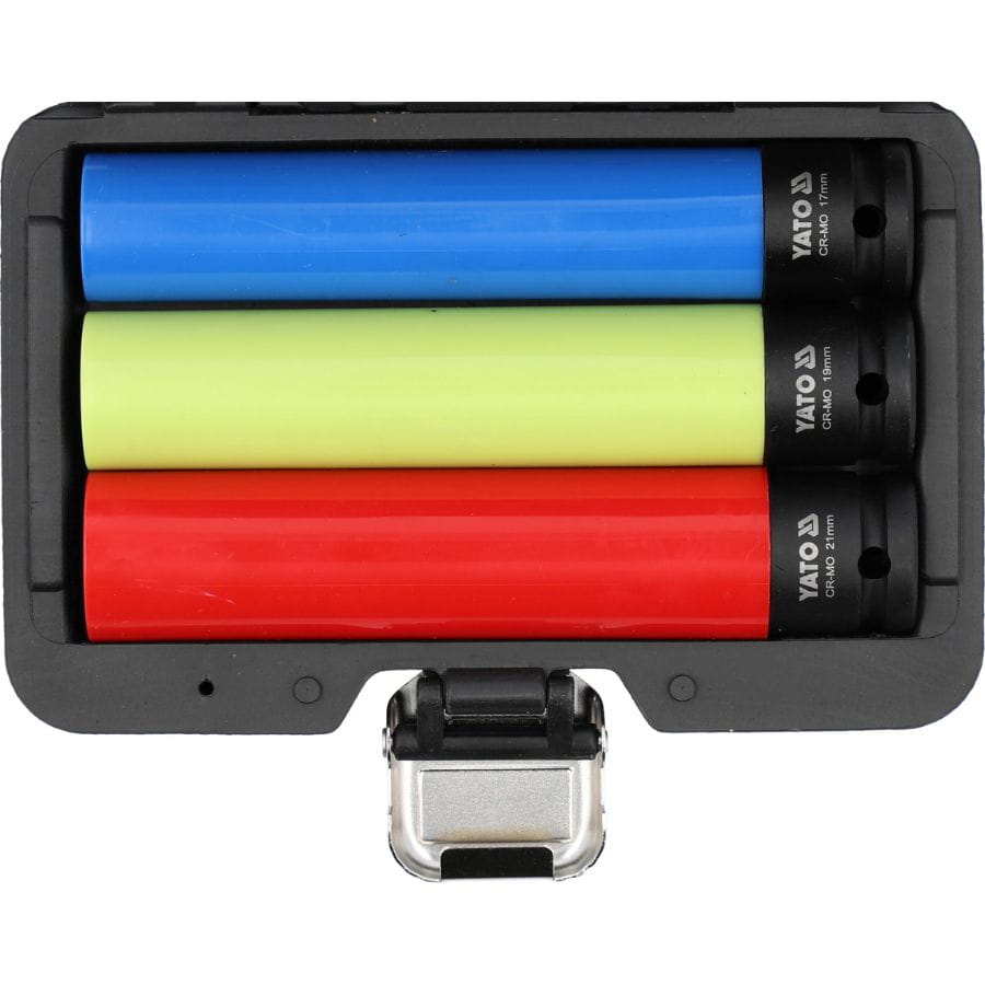 Zestaw 3 długich nasadek udarowych Yato YT-10565, 17-21 mm, stal Cr-Mo, nylonowa powłoka, As-Drive, do felg aluminiowych, serwisów i warsztatów – trwałość i bezpieczeństwo.