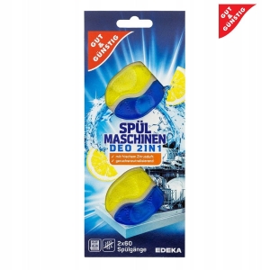 Odświeżacz zapach cytrynowy G&G 2?szt. do zmywarki. Neutralizuje brzydkie zapachy, zapobiega zaciekom i pozostawia świeży cytrusowy aromat przez 120 cykli.