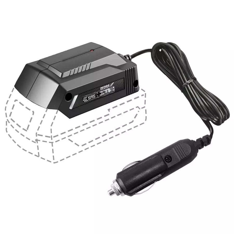 ładowarka DED7038A umożliwia ładowanie akumulatora poprzez 12V gniazdo zapalniczki co jest nieocenione podczas dojazdów na miejsce pracy lub powrotu z niej, aby urządzenie było gotowe do pracy od razu po przybyciu