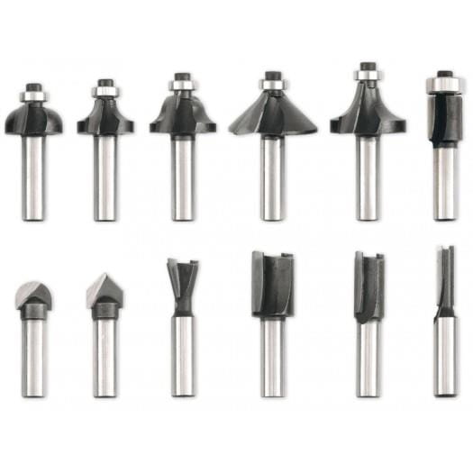 Zestaw frezów do drewna 12 szt, których ostrza są wykonane z węglików spiekanych. Są to frezy przeznaczone do obróbki twardego i miękkiego drewna, sklejek, płyt wiórowych itp.