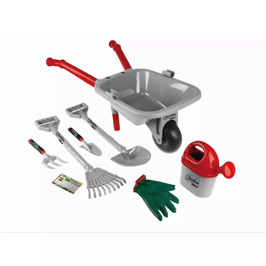 - zestaw zawiera 8 elementów: taczka, łopata, grabie, małe grabki, mała łopatka, konewka, rękawice dziecięce, papierowa wizytówka