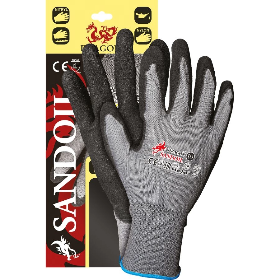 Rękawice robocze Dragon Sandoil rozm.10;- ochronne wykonane z szarego nylonu i powlekane podwójną warstwą nitrylu Sandy Finish łączą wytrzymałość z doskonałym dopasowaniem. Bezszwowy krój oraz elastyczny ściągacz zapewniają wygodę użytkowania, chroniąc dłonie przed podrażnieniami, smarami, olejami i węglowodorami.