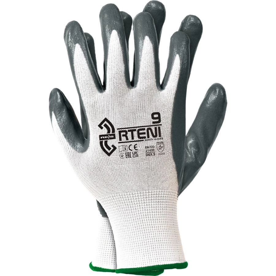 Rękawice robocze Rteni Nitryl rozmiar 9 to uniwersalne rękawice ochronne przeznaczone do prac mechanicznych i montażowych. Model wykonany z elastycznej dzianiny poliestrowej powlekanej gładkim nitrylem zapewnia doskonałe dopasowanie, chwytność i ochronę dłoni podczas pracy.