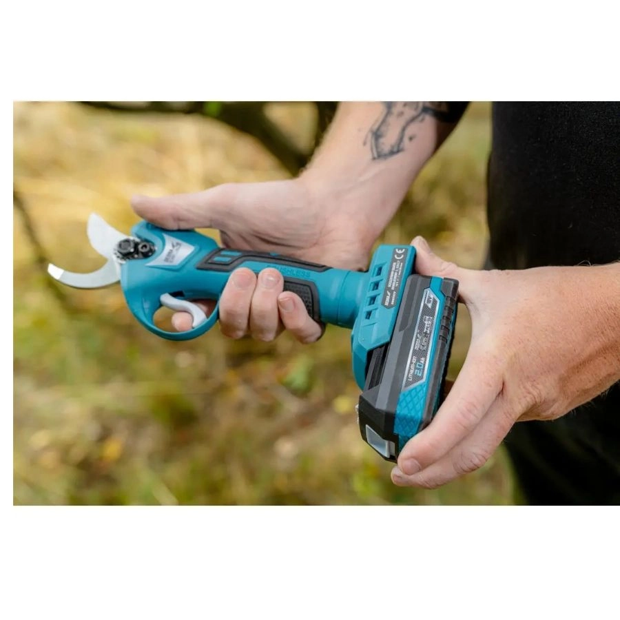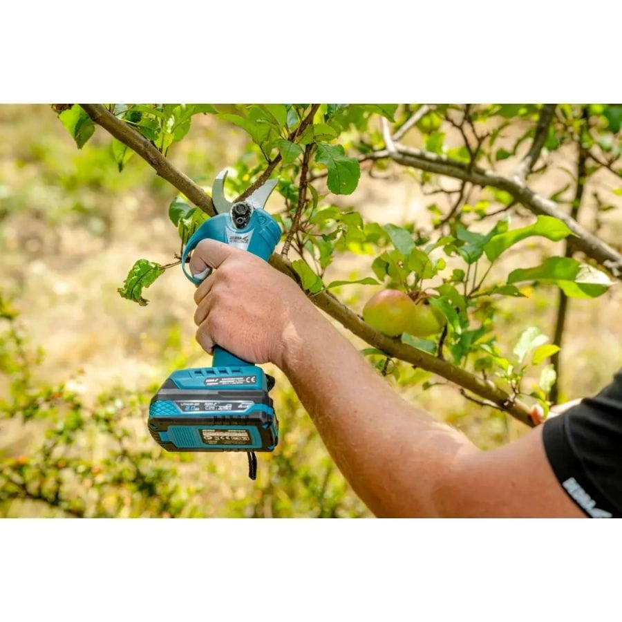 Sekator akumulatorowy Dedra DED7177 18V SAS+ALL z silnikiem bezszczotkowym i ostrzem laserowym. Cięcie do 30 mm, lekki, ergonomiczny i wydajny do ogrodu i sadu.