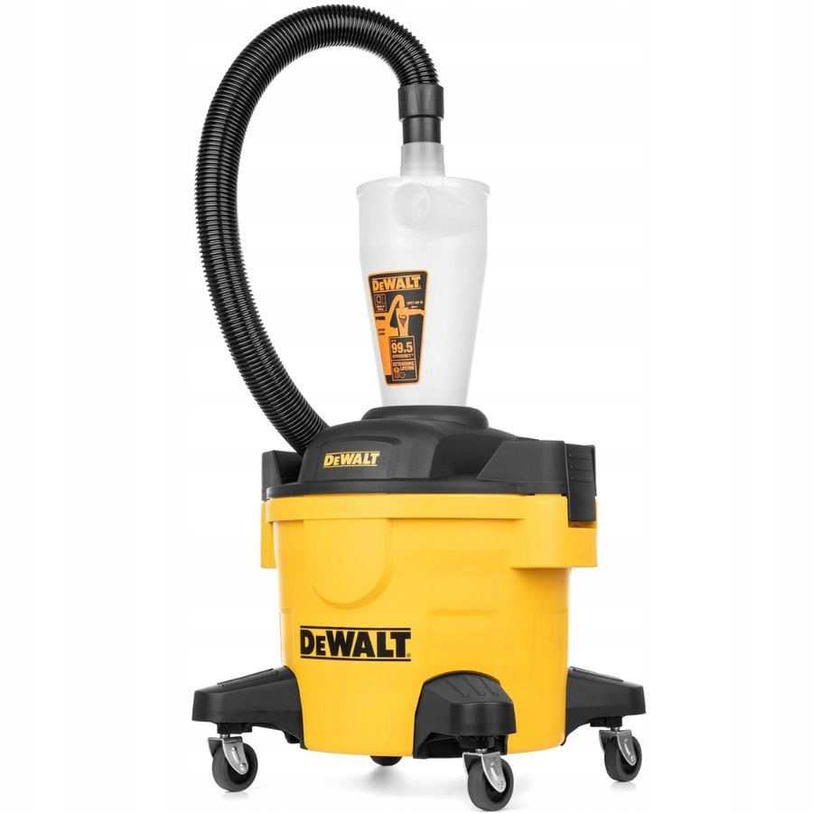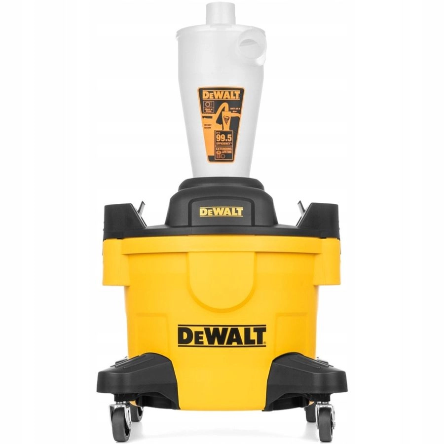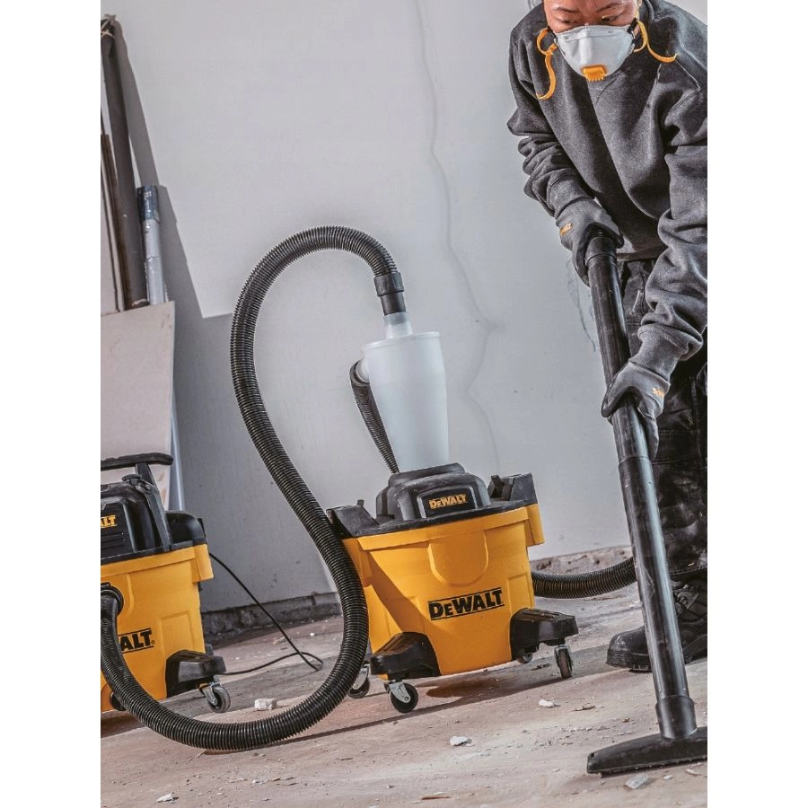 Separator cyklonowy DEWALT DXVCS002 23L do odkurzaczy przemysłowych. Usuwa 99,5% pyłu, zwiększa siłę ssania, chroni filtr, praca na mokro i sucho, mobilny i uniwersalny.