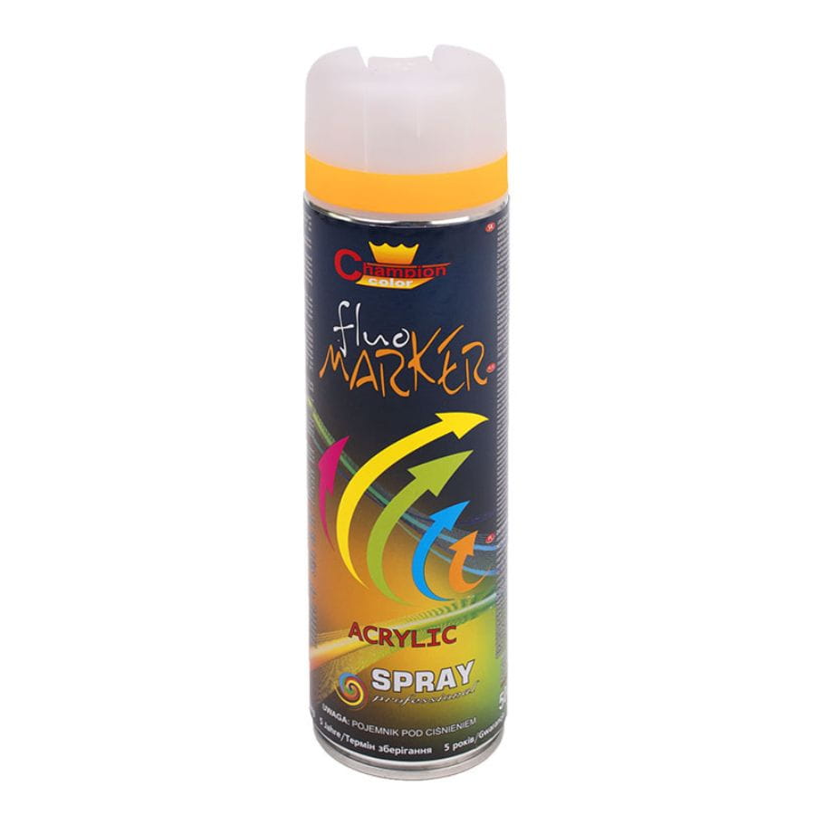 Fluorescencyjny spray marker Champion, kolor pomarańczowy. Akrylowa farba szybkoschnąca do znakowania: drogi, drzewa, instalacje. Malowanie w każdej pozycji dzięki dyszy 360°.