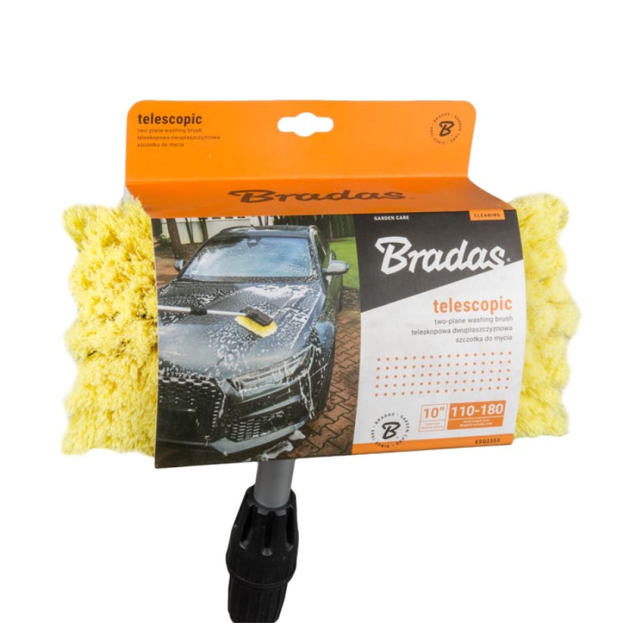 Szczotka samochodowa Bradas ESQ2355 teleskopowa 135–250 cm z miękkim włosiem. Chroni lakier, łatwa w użyciu i podłączeniu do węża. Idealna do samochodów, okien i powierzchni delikatnych.