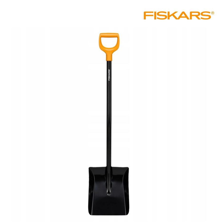 Szufla do betonu Fiskars Solid+ 1067518 ze stali borowej. Wytrzymała łopata do przenoszenia piasku, żwiru i mokrego betonu. Ergonomiczny trzonek i uchwyt D dla komfortu pracy.
