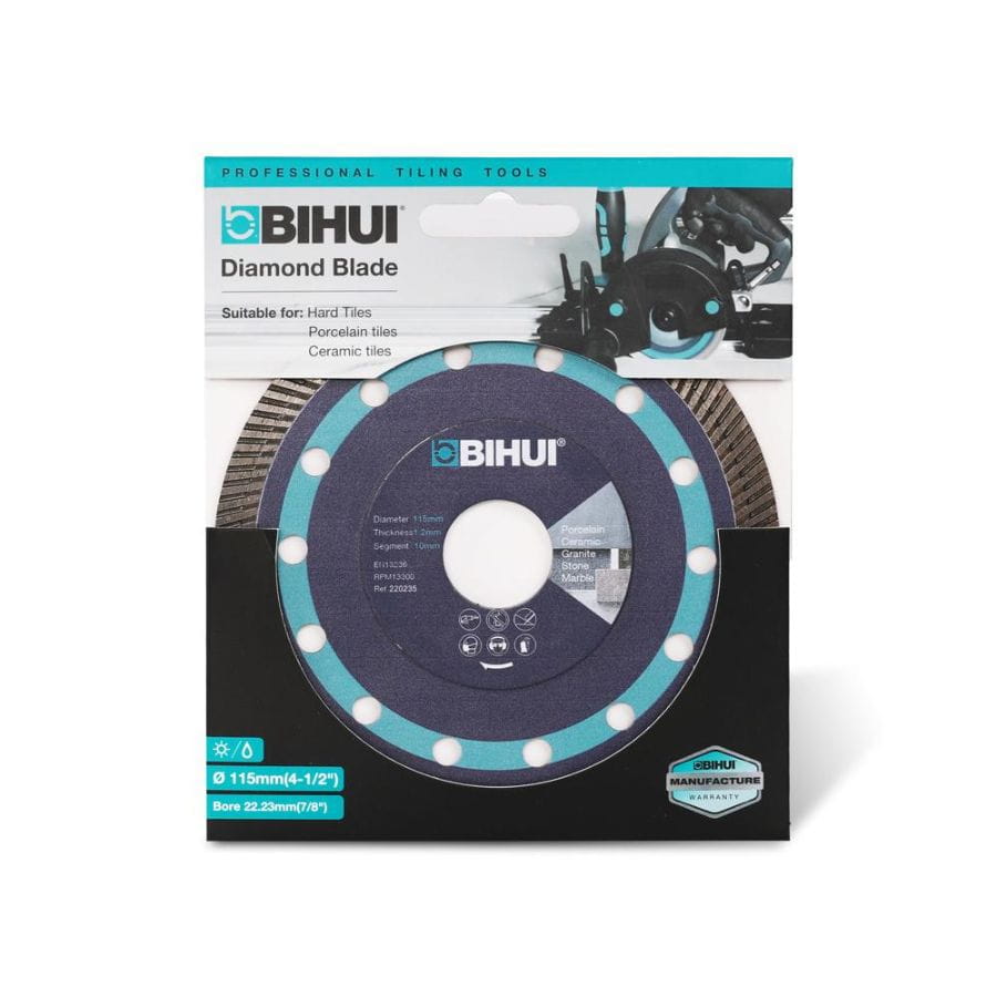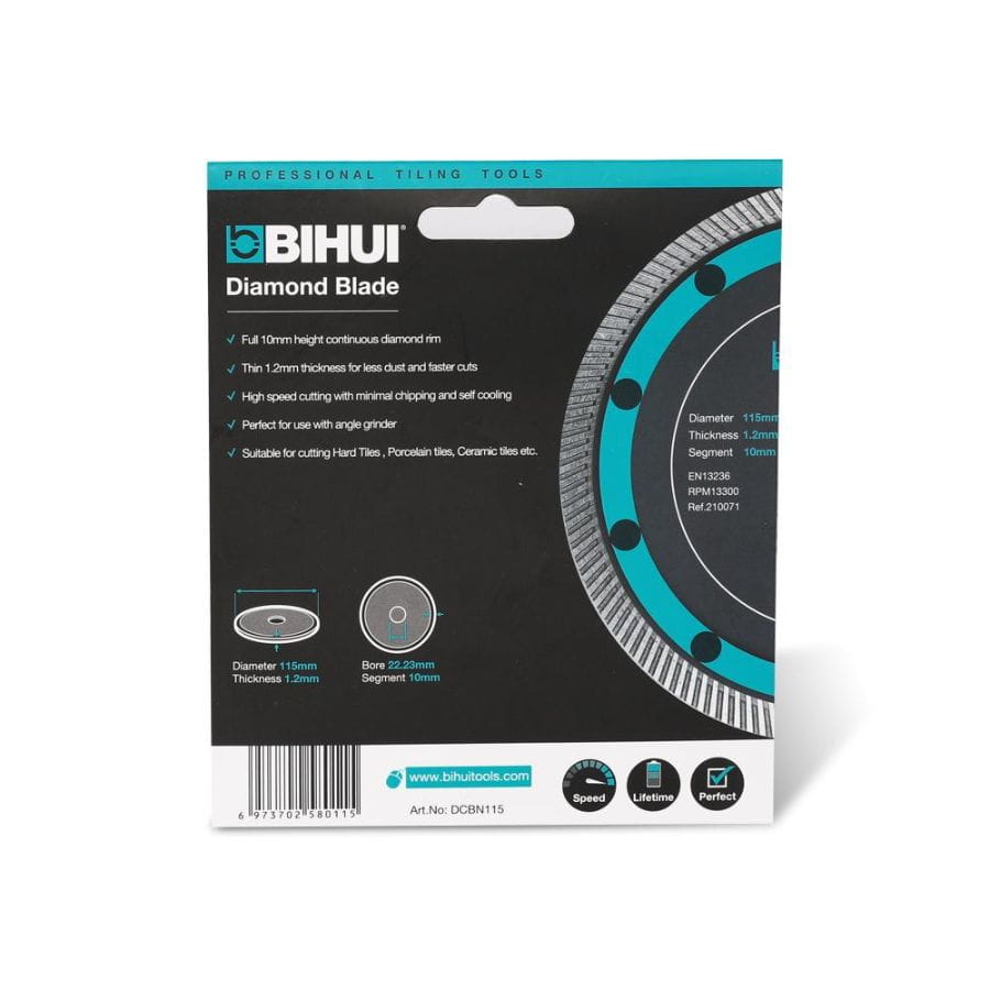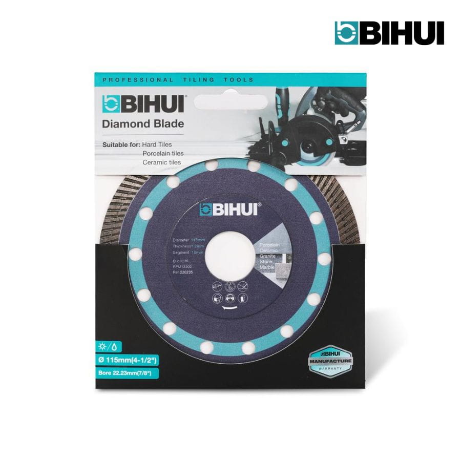 Tarcza diamentowa pełna 115mm Bihui DCBN115 SUPER THIN do precyzyjnego suchego cięcia. Ultra cienkie zęby, minimalna ilość pyłu, trwałość i stabilność przy pracy.