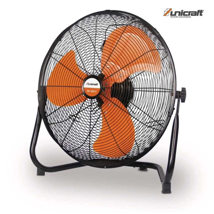 Wentylator podłogowy Unicraft BV 500-3 6265153. Trzy stalowe łopatki, regulacja kąta, trzy prędkości. Wydajny, cichy i stabilny wentylator przemysłowy do hal i warsztatów.