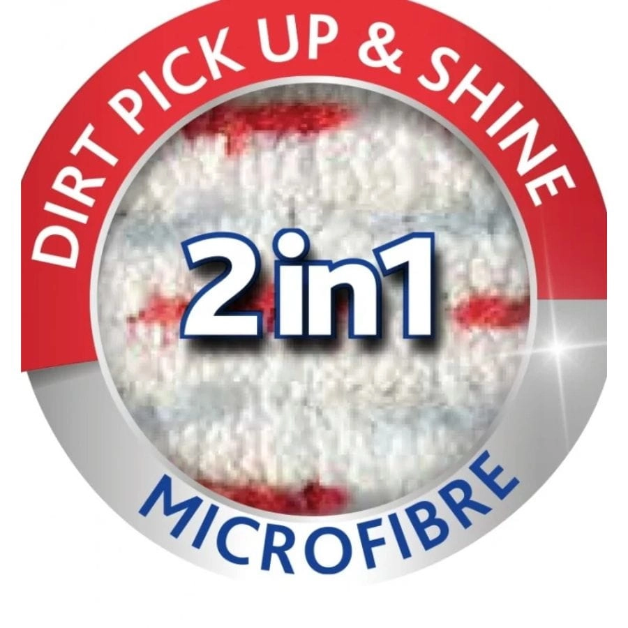 - Mikrofibra 2w1 – czerwone i szare włókna usuwają uporczywy brud, białe polerują.