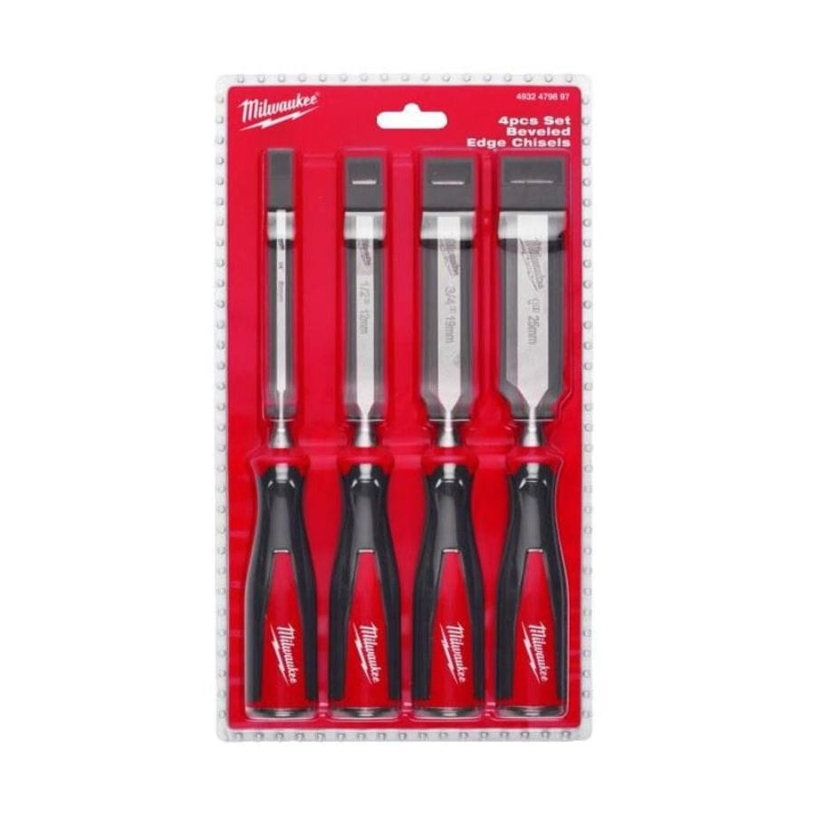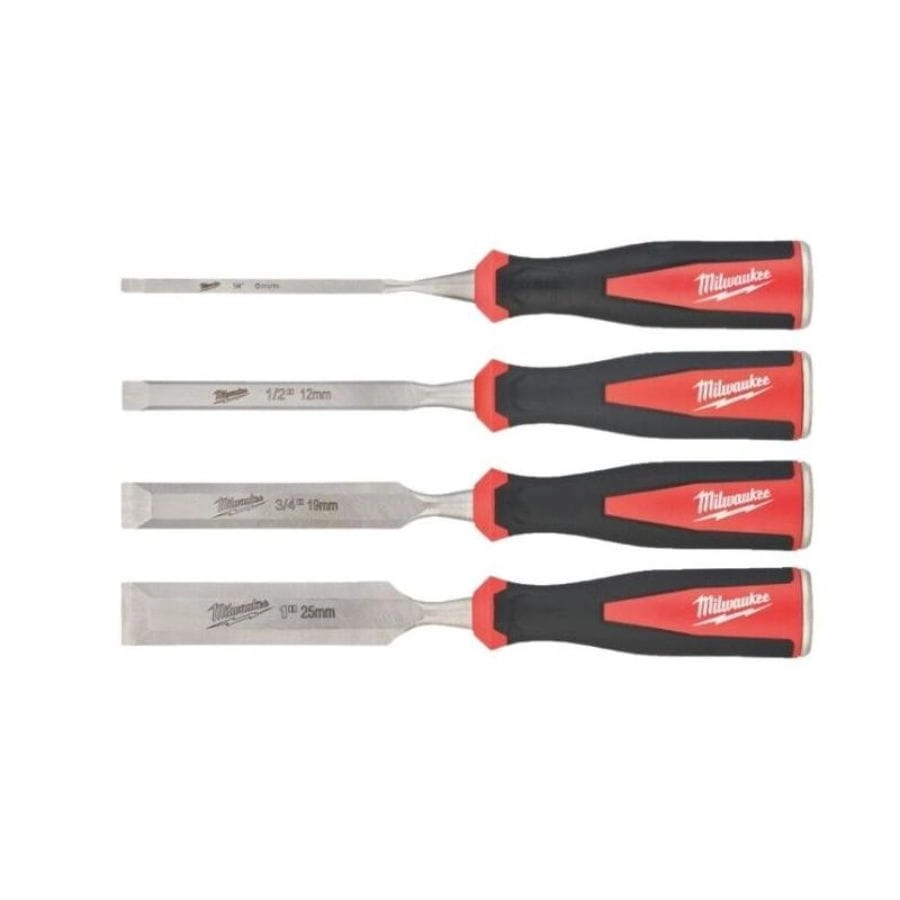 Zestaw dłut Milwaukee 4932479897 – 4 szt. (6–25 mm), sfazowana krawędź, stalowa końcówka do pobijania, metalowy rdzeń, trwałe oznaczenia, idealne do precyzyjnej obróbki drewna.