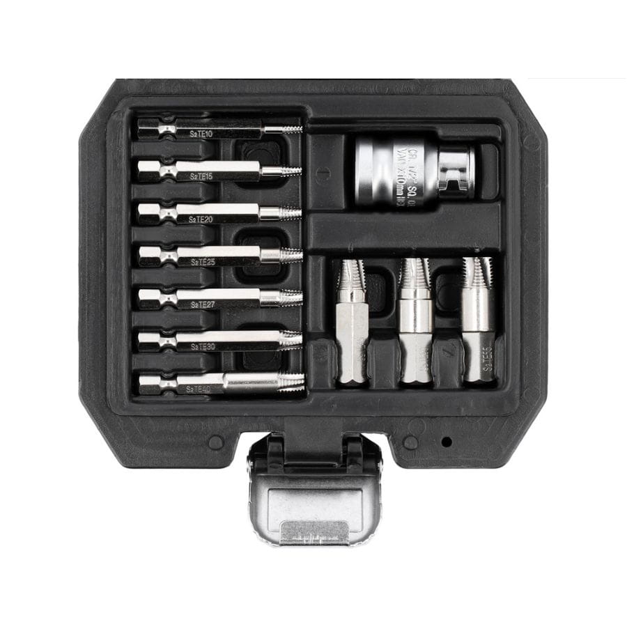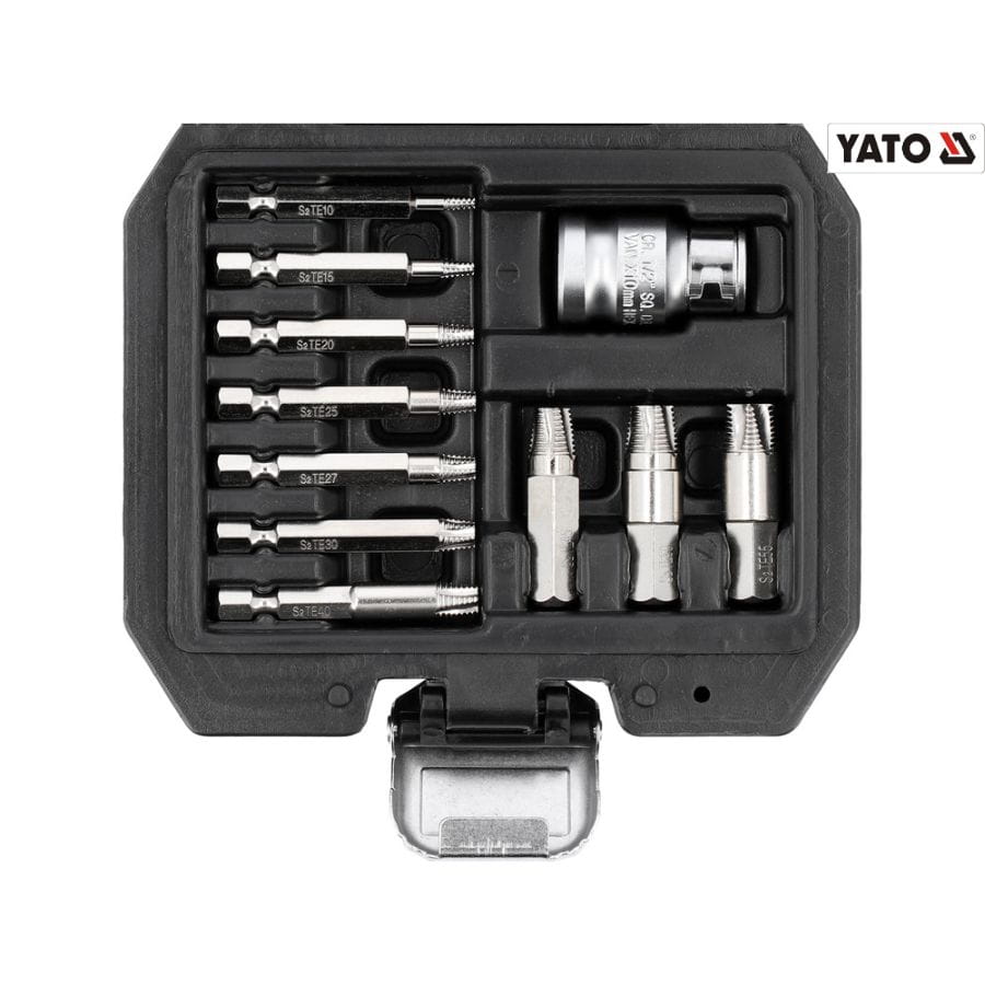 Zestaw wykrętaków Yato YT-04582 do obrobionych śrub. 11 elementów, spiralna konstrukcja, stal CrV, adapter, walizka. Do warsztatu i prac serwisowych.